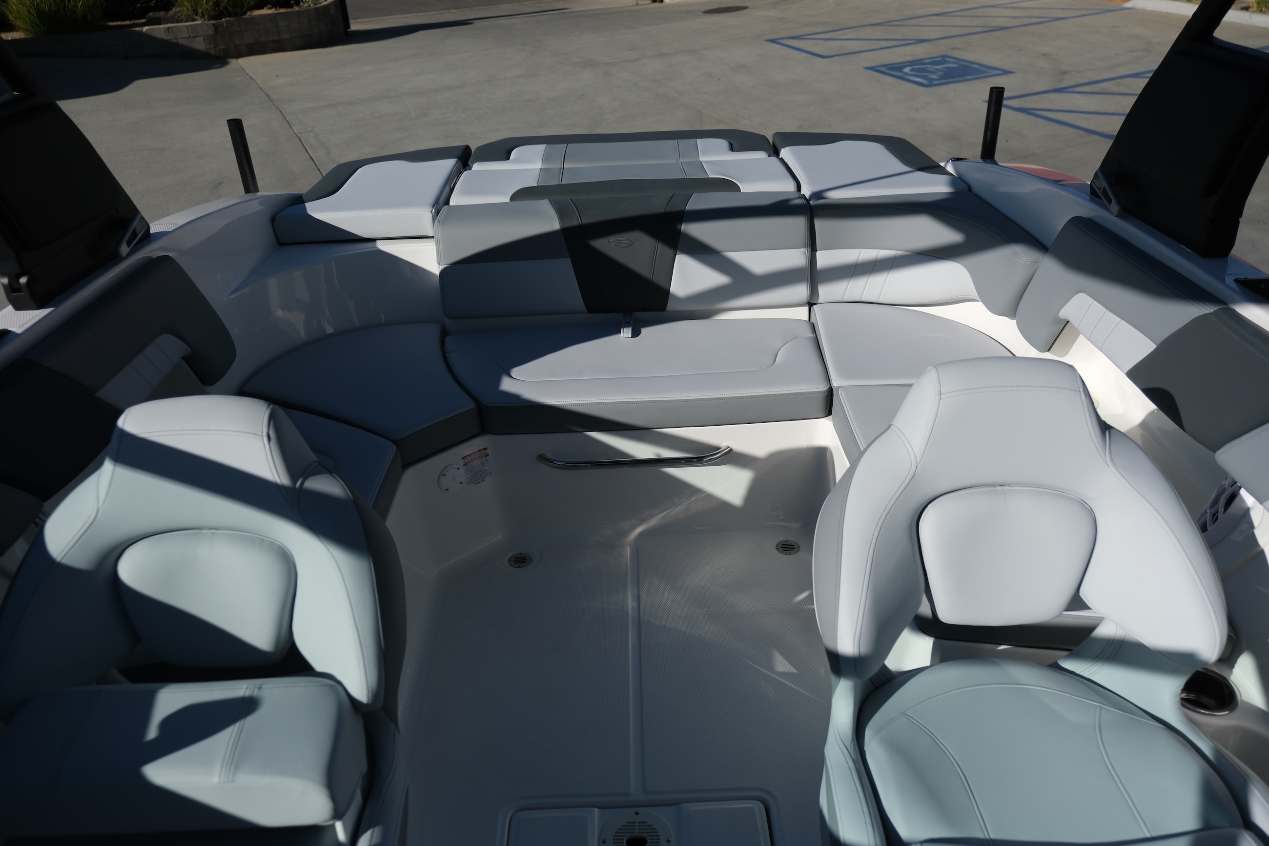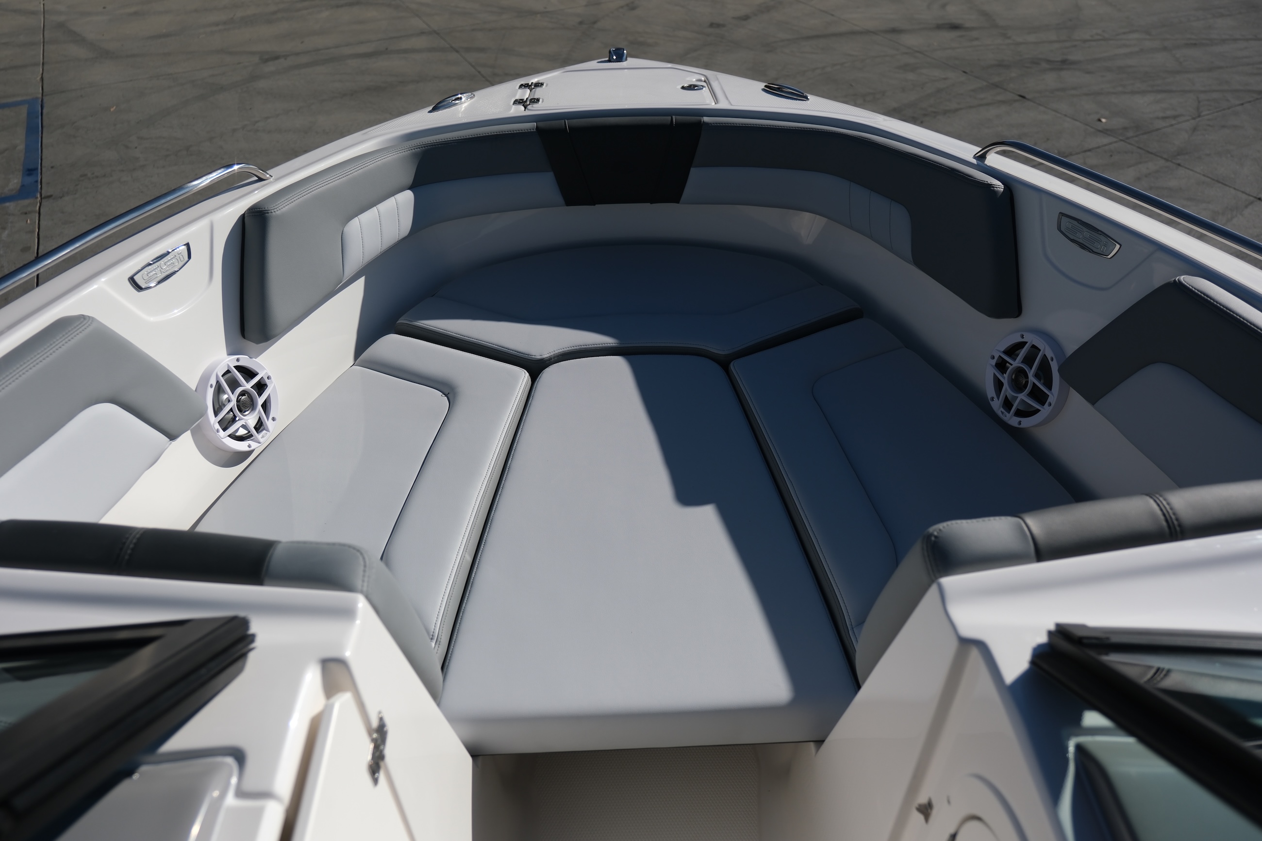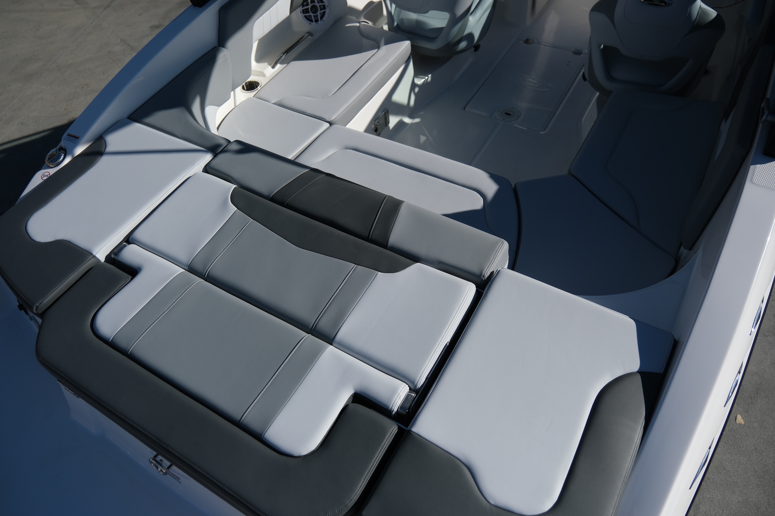 - Cockpit Layout: Two Bucket Seats (Slide and Swivel) with Logo Badging, U-Shaped Seating and Aft Hinged Sundeck with Walk-Thru, Lounge Position and Aft Facing Seat
