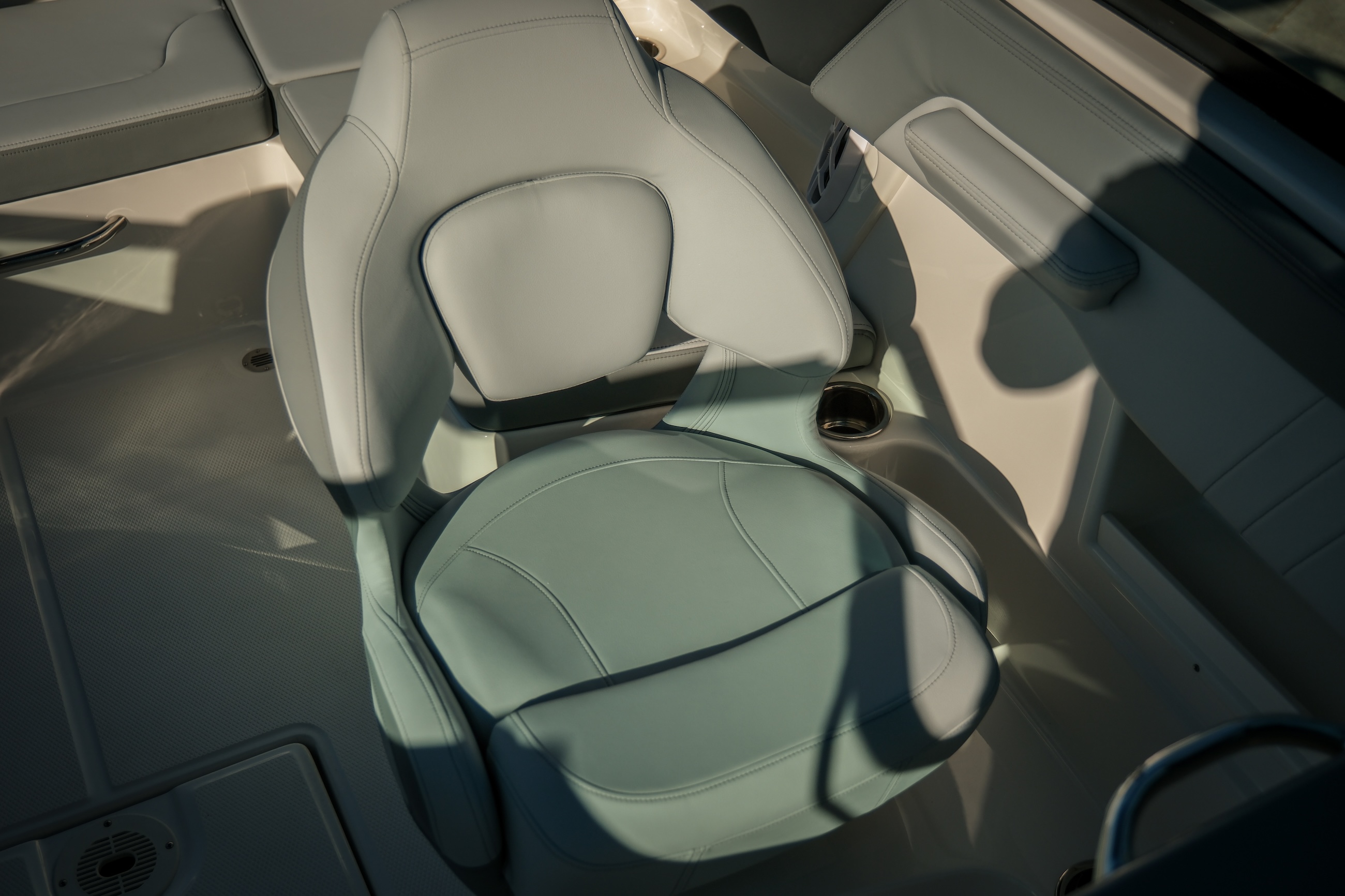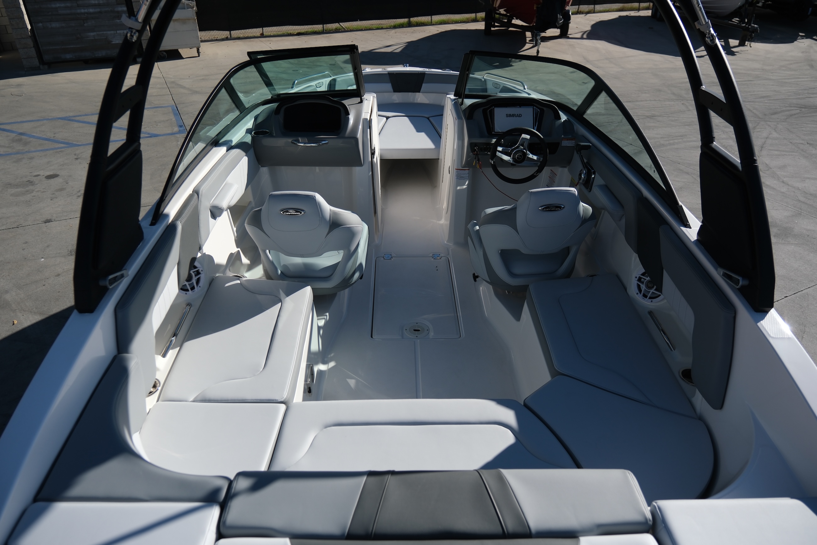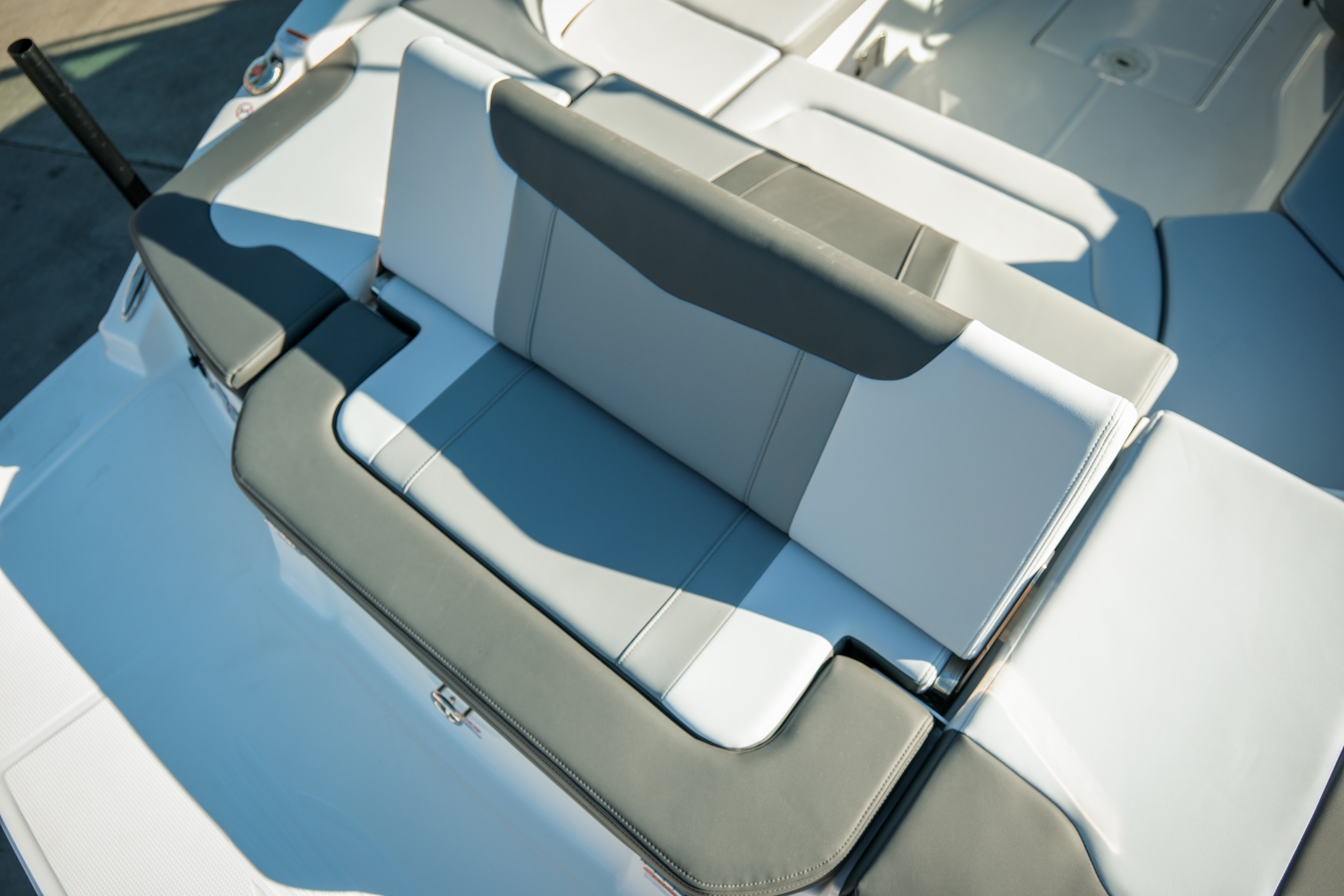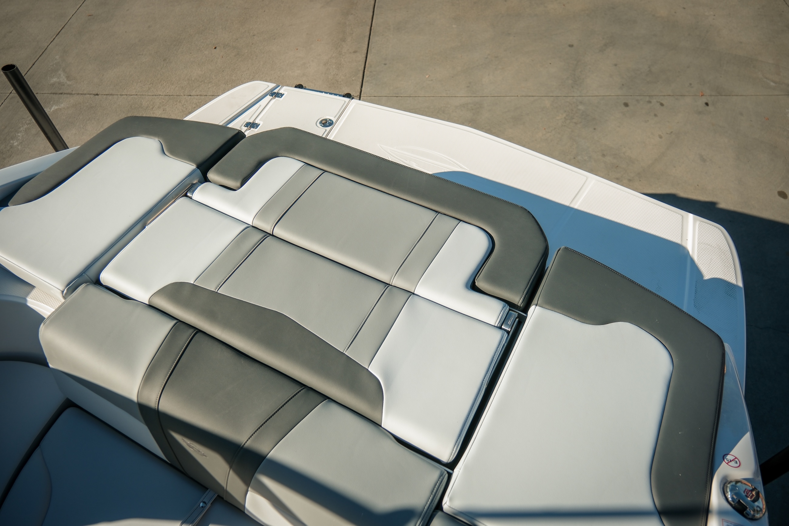 - Cockpit Layout: Two Bucket Seats (Slide and Swivel) with Logo Badging, U-Shaped Seating and Aft Hinged Sundeck with Walk-Thru, Lounge Position and Aft Facing Seat